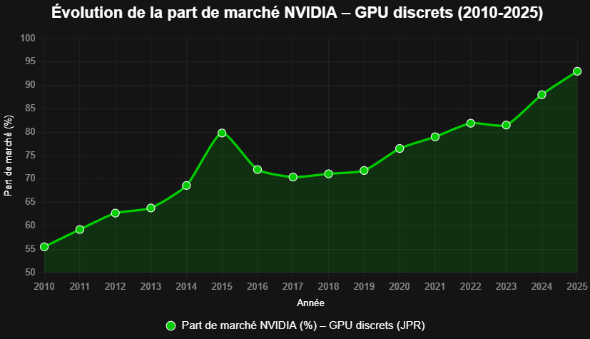 Si Nvidia a toujours été en compétition avec AMD, cette dernière n’a jamais été réellement en mesure d’inquiéter le titan au regard d’émeraude, dont la domination ne cesse d’être de plus en plus écrasante.