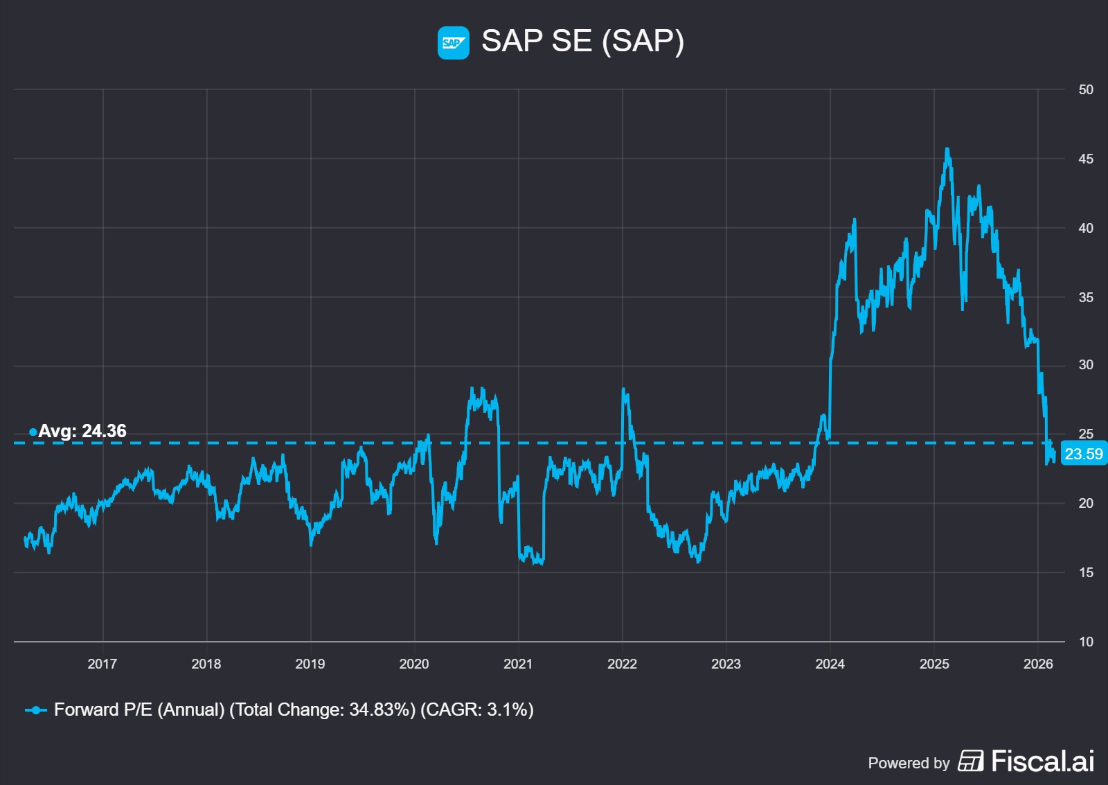 SAP à 170€ constitue une réelle opportunité d’achat sur un mastodonte de la technologie européenne avec de belles perspectives de croissances sur les prochaines années. Mais l’ombre de Claude et de la cannibalisation du secteur software par l’IA plane et empêche de sérieusement considérer un réel rebond. Il est possible que l’hémorragie continue malgré les bons résultats car le narratif est très puissant et les multiples restent relativement élevés à plus de 23 fois les bénéfices de l’année suivante.
