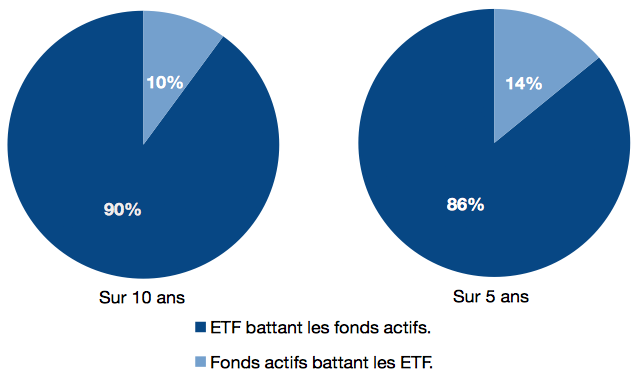 Puis en 1970, Eugene Fama formalise l'hypothèse de l'Efficience des Marchés selon laquelle le prix d'un actif financier est la somme de toute l'information disponible à son sujet. Cela signifie qu’il ne sert à rien de perdre son temps à trouver des actions à potentiel ou sous-valorisée car elles sont en permanence aux juste prix selon les données financières et économiques disponibles. En résumé, le marché a toujours raison et par conséquent il est complètement vain d’essayer de le battre. Une logique qui est entièrement contradictoire avec la stratégie de stock picking qui consiste à sélectionner des sociétés que l’on estime être mal appréciées par le marché. Cette théorie est parfaitement illustrée par les résultats démontrant la grande supériorité des ETF indiciels (réplication automatique du marché) sur les OPC géré par des professionnels de la finance. Les gestionnaires de fonds (OPC) ne battent le marché que dans 1 cas sur 10.