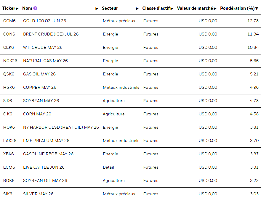 Grâce à cette mécanique, il est possible d'avoir un accès direct sur PEA à l'indice Bloomberg Commodity, qui est composé de contrats à terme (Futures) sur plusieurs matières premières dont le pétrole, l'or, le cuivre, le gaz ou le blé. Le ETF qui crée cette porte dérobée est le iShares Diversified Commodity Swap UCITS ETF (DE000A0H0728) de Blackrock. Attention cependant de bien l'acheter sur la bourse de Paris et non celle de Francfort (XETRA) pour éviter des frais de courtier supplémentaires.
